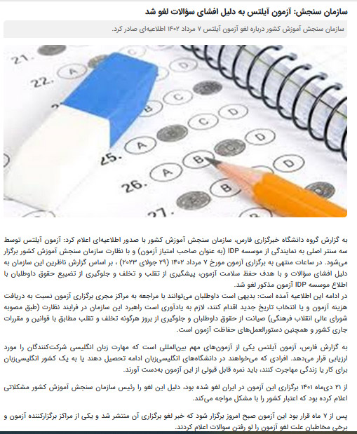 دلیل لغو آزمون آیلتس در 7 مرداد 1402 برمبنای خبرگزاری فارس این چنین اعلام شد: