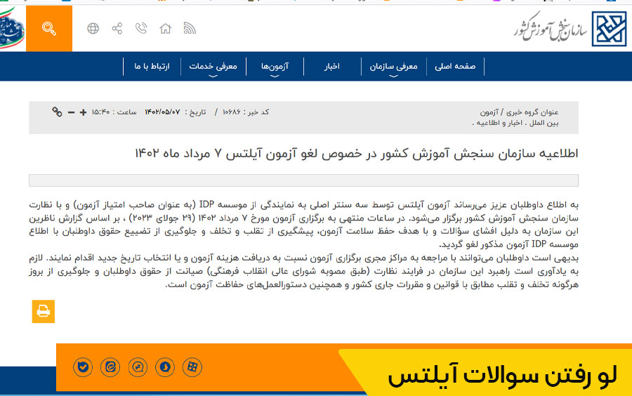 سازمان سنجش آموزش کشور در خصوص لغو آزمون آیلتس ۷ مرداد ماه ۱۴۰۲ اطلاعیه ای صادر کرد.